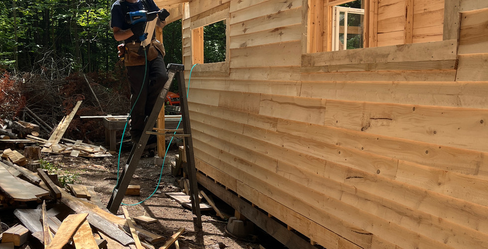 The platform is 28 feet by 30 feet, built with a mix of conventional lumber and milled lumber from trees felled from the build site, as well as other locations on our land and from our neighbours who had been clearing some trees. This brook-side platform is a covered deck that will serve as a seasonal space with the sides mostly screened to allow for a feeling of being in the forest with protection from the elements and little biting critters.